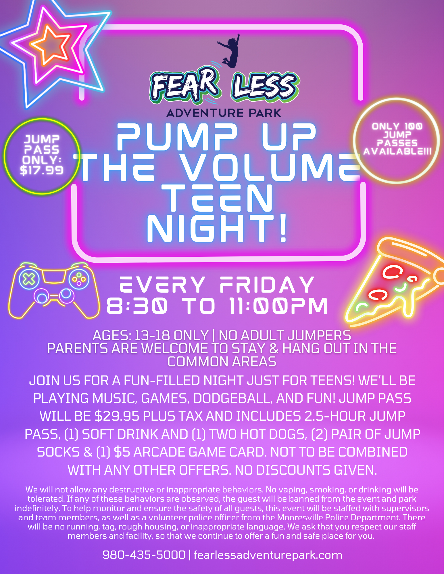 We reserve the right to remove any guest who is not following the posted rules, acting in a way that is dangerous to themselves or other guests, and who ignores the instructions of the team members. No refunds will be issued to guest who violate the rules and terms outlined here and posted around our facility, and their actions cause their visit to be terminated. Failure to have a valid waiver and pass will subject the guest to removal for trespassing at this facility.