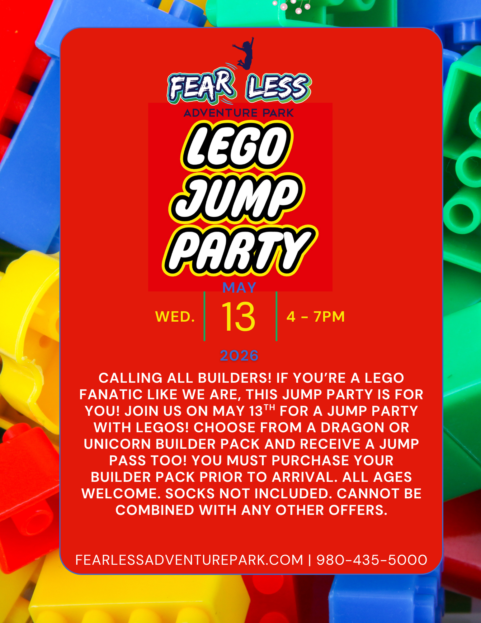 Join us to build, jump and have fun on Wednesday, May 15th, from 4-7pm! Your builder pack includes Legos, jump pass, and cotton candy.